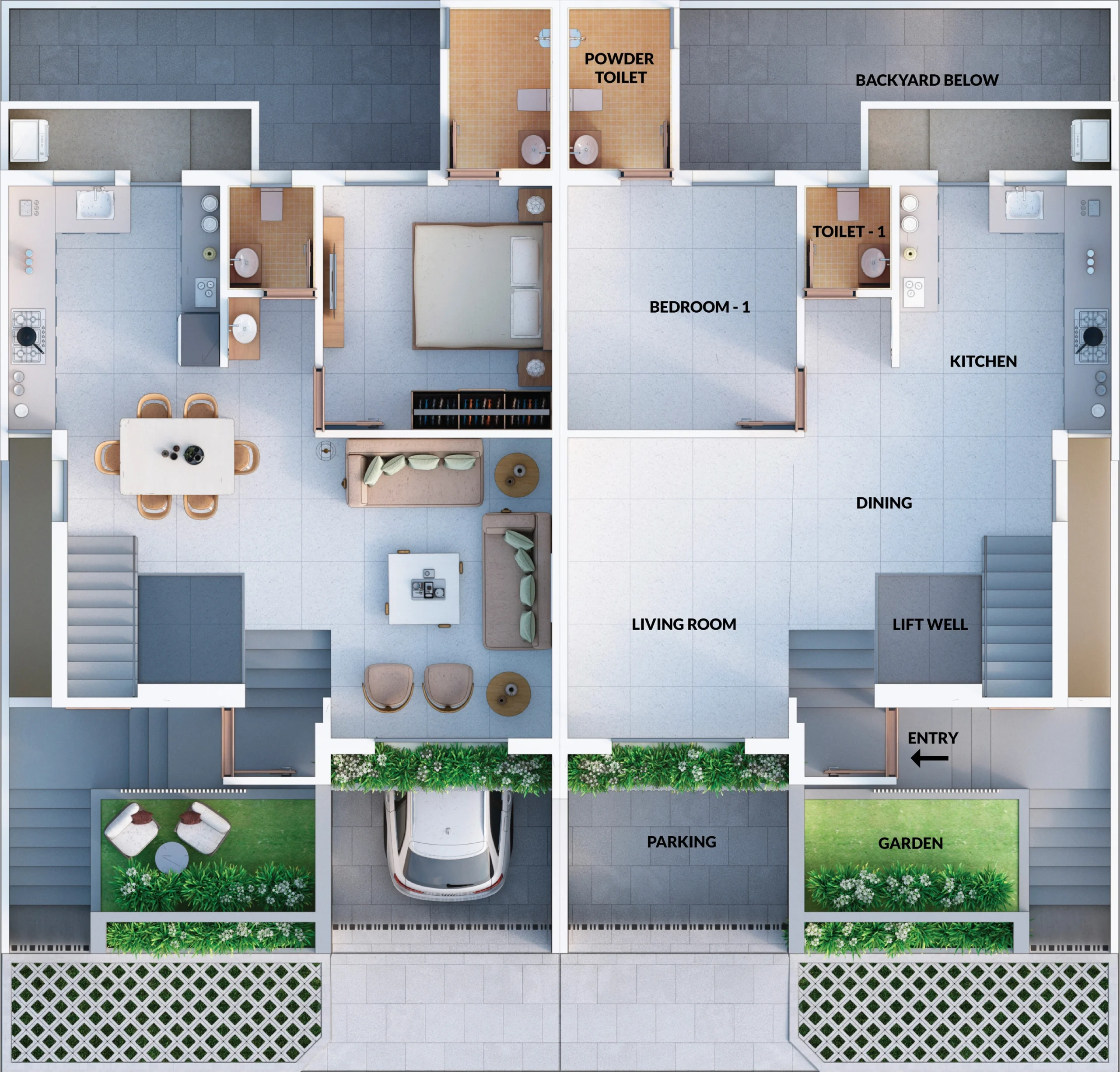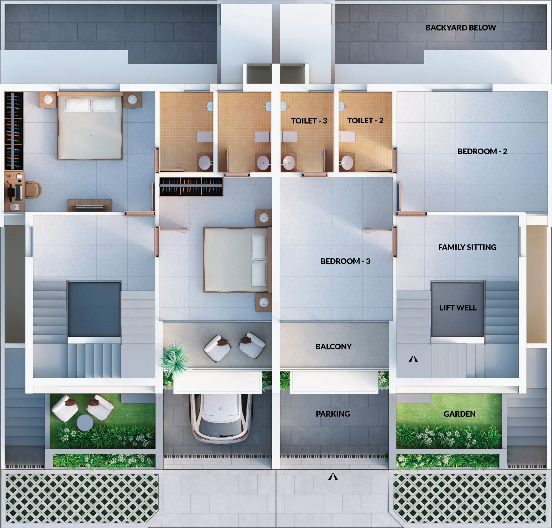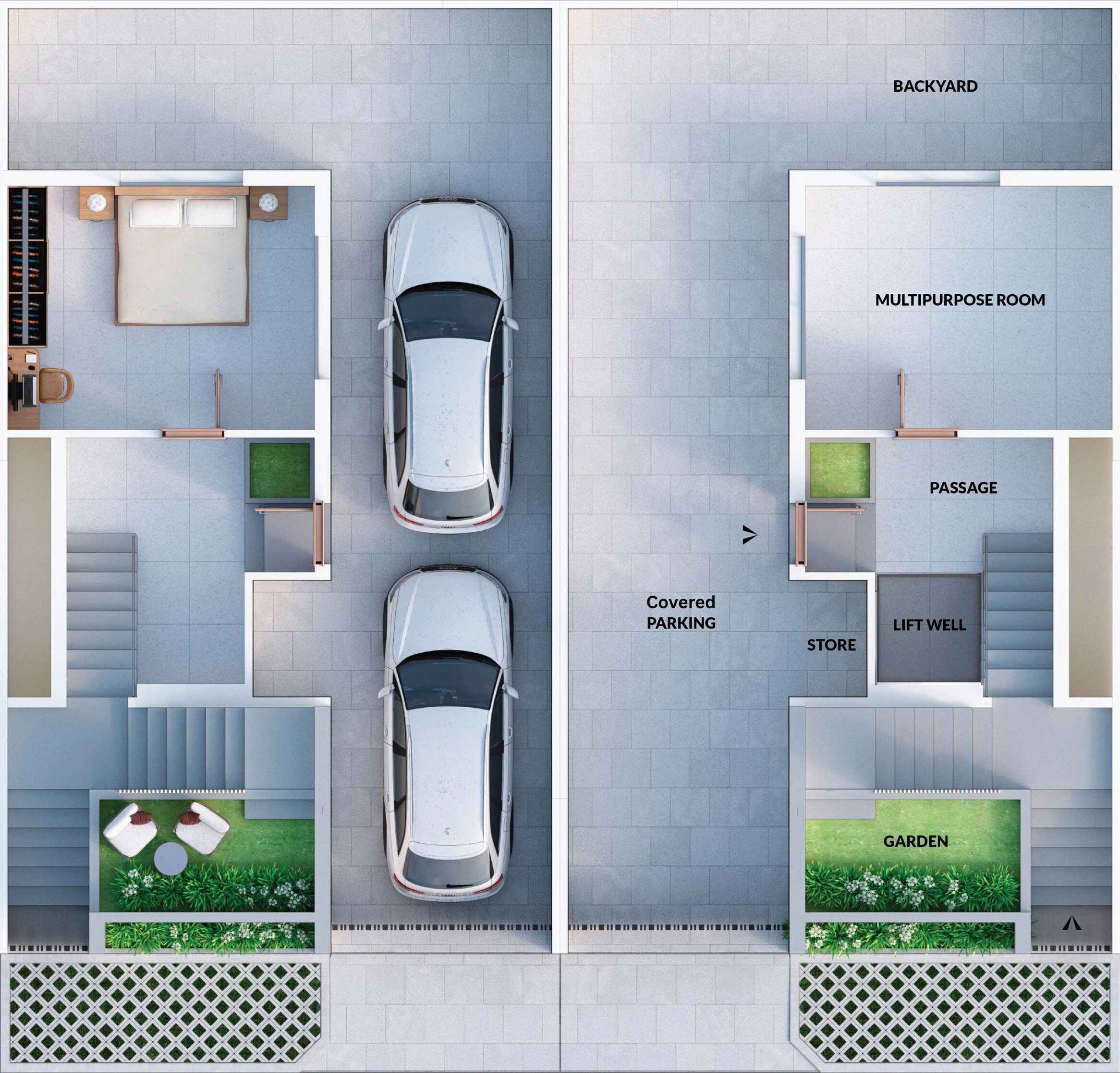 - Two individual covered car parking space